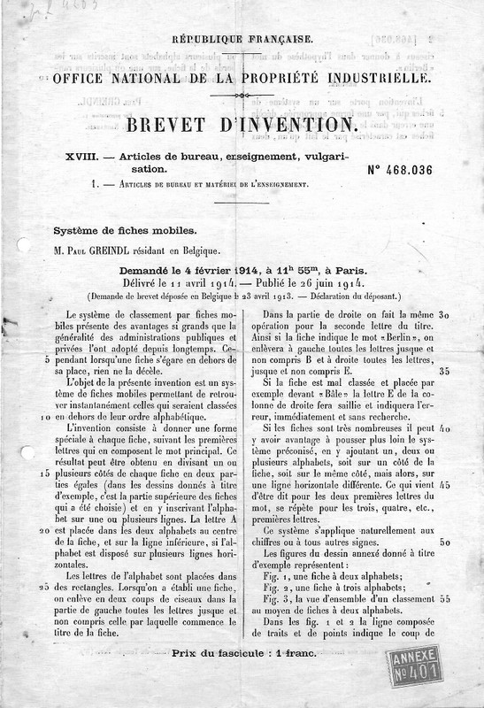 Brevet français pour son système de fiches mobiles