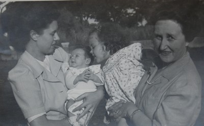 Titane Greindl dans les bras de sa mère Jacqueline de Meeûs et Isabelle dans les bras de sa grand-mère de Clotilde de Meeûs à Elisabethville